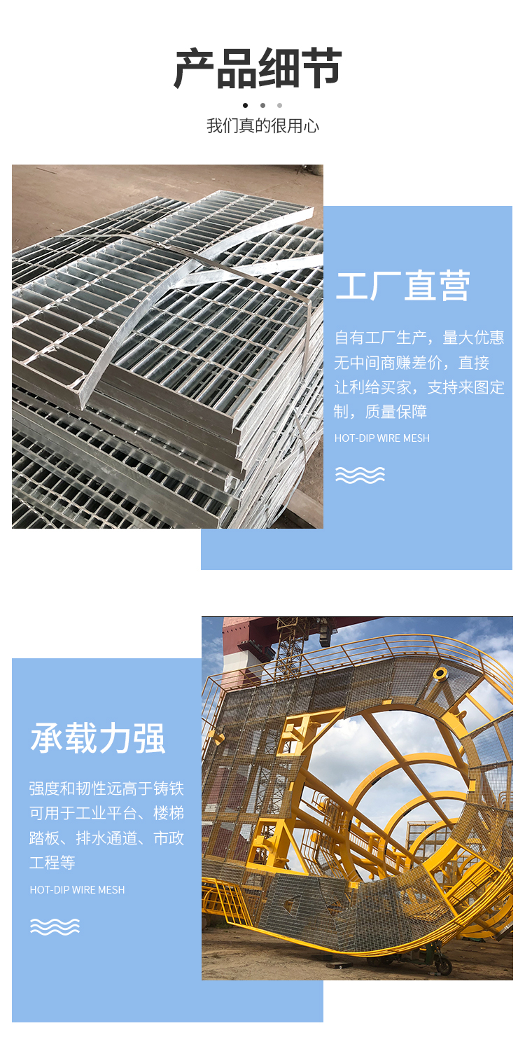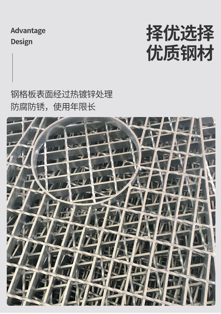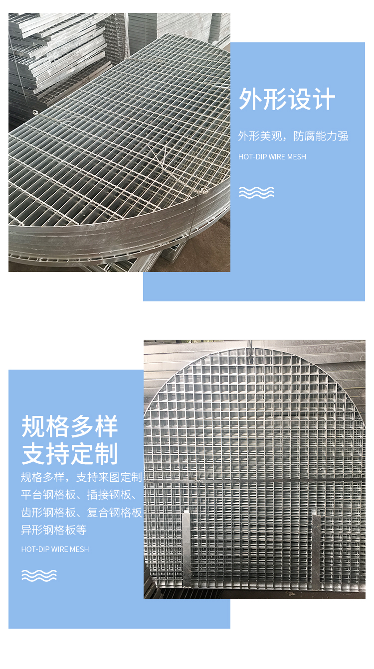 产品简介:格栅板是用扁钢按照一定的间距和横杆进行交叉排列,并且焊接成中间带有方形格子的一种钢铁制品,主要用来做水沟盖板,钢结构平台板,钢梯的踏步板等,横杆一般采用经过扭绞的方钢。钢格栅板一般采用碳钢制作,外表热镀锌,可以起到防止氧化的作用。也可以采用不锈钢制作.钢格栅板具有通风,采光,散热,防滑,防爆等性能。1.强度高,自重轻;2.防腐能力强,经久耐用;3.外形美观,表面亮泽;4.不积污物,不积雨雪,不积水,自清洁,易于维护;5.通风,采光,散热,防滑,防爆性好;6.便于安装及折卸 。