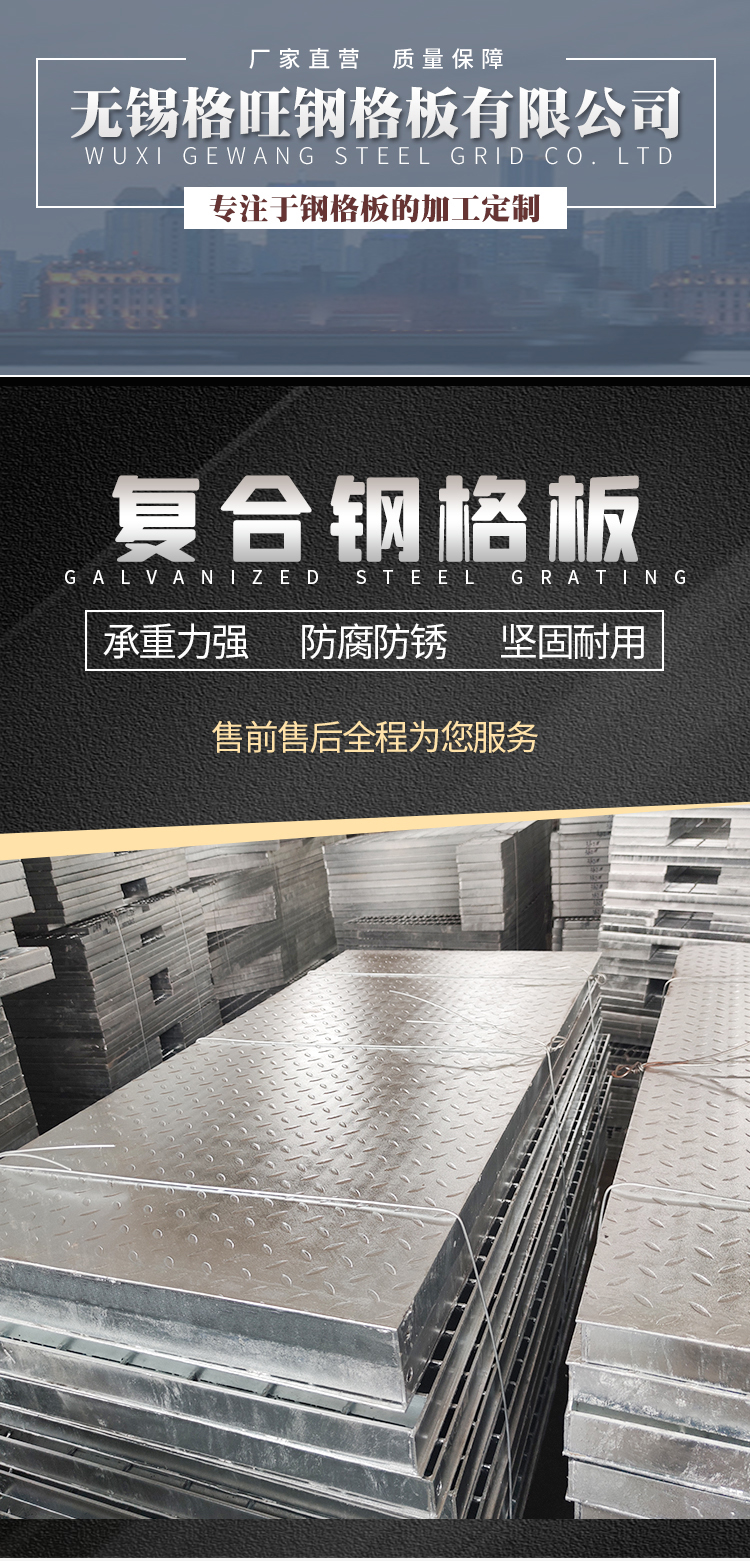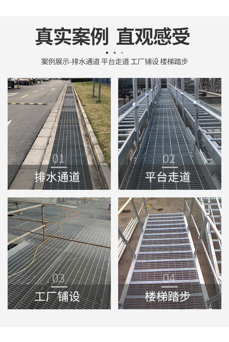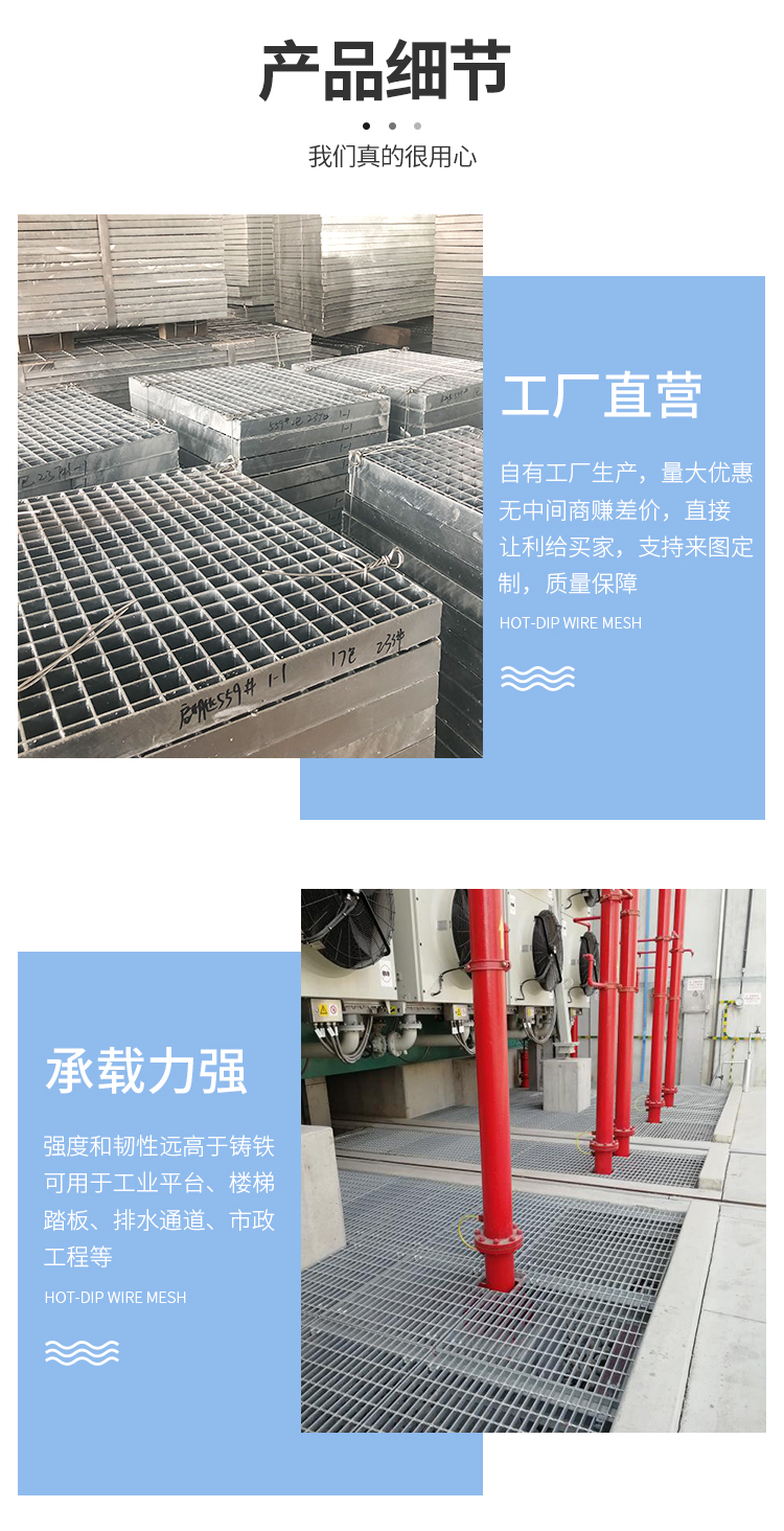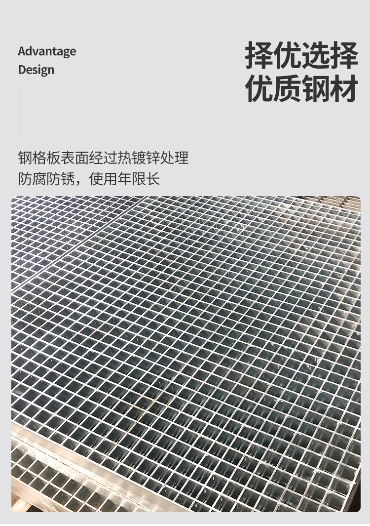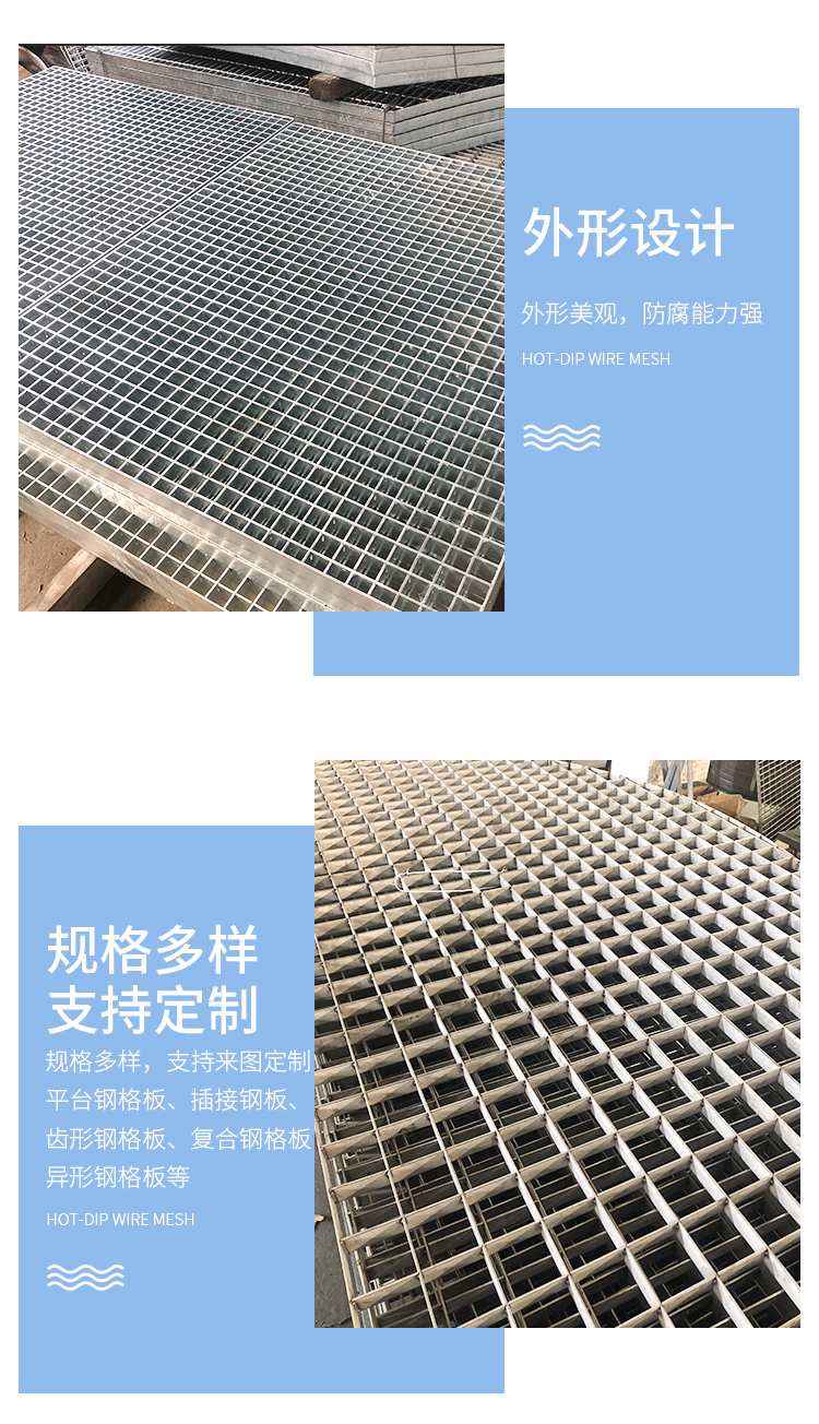 产品简介:格栅板是用扁钢按照一定的间距和横杆进行交叉排列,并且焊接成中间带有方形格子的一种钢铁制品,主要用来做水沟盖板,钢结构平台板,钢梯的踏步板等,横杆一般采用经过扭绞的方钢。钢格栅板一般采用碳钢制作,外表热镀锌,可以起到防止氧化的作用。也可以采用不锈钢制作.钢格栅板具有通风,采光,散热,防滑,防爆等性能。1.强度高,自重轻;2.防腐能力强,经久耐用;3.外形美观,表面亮泽;4.不积污物,不积雨雪,不积水,自清洁,易于维护;5.通风,采光,散热,防滑,防爆性好;6.便于安装及折卸 。