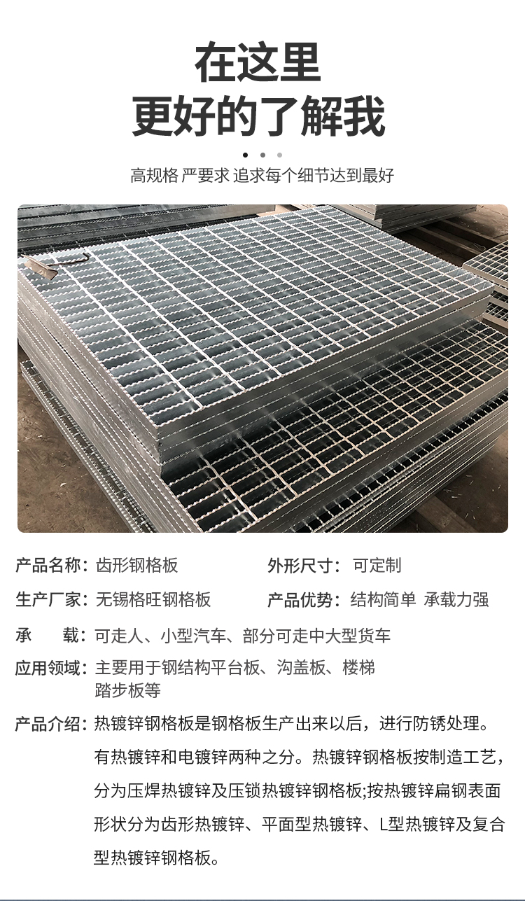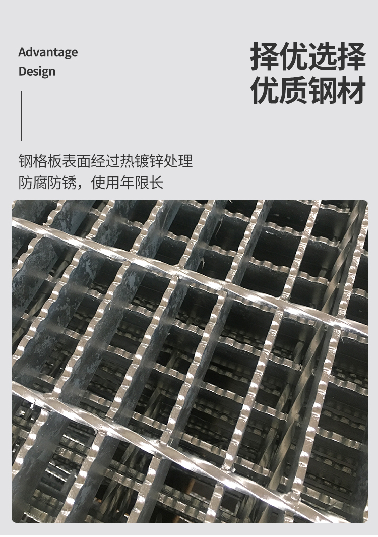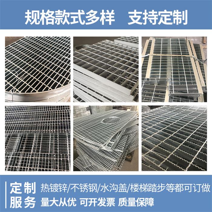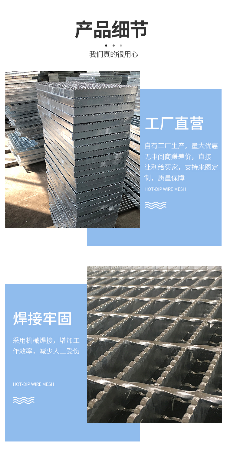产品简介:格栅板是用扁钢按照一定的间距和横杆进行交叉排列,并且焊接成中间带有方形格子的一种钢铁制品,主要用来做水沟盖板,钢结构平台板,钢梯的踏步板等,横杆一般采用经过扭绞的方钢。钢格栅板一般采用碳钢制作,外表热镀锌,可以起到防止氧化的作用。也可以采用不锈钢制作.钢格栅板具有通风,采光,散热,防滑,防爆等性能。1.强度高,自重轻;2.防腐能力强,经久耐用;3.外形美观,表面亮泽;4.不积污物,不积雨雪,不积水,自清洁,易于维护;5.通风,采光,散热,防滑,防爆性好;6.便于安装及折卸 。