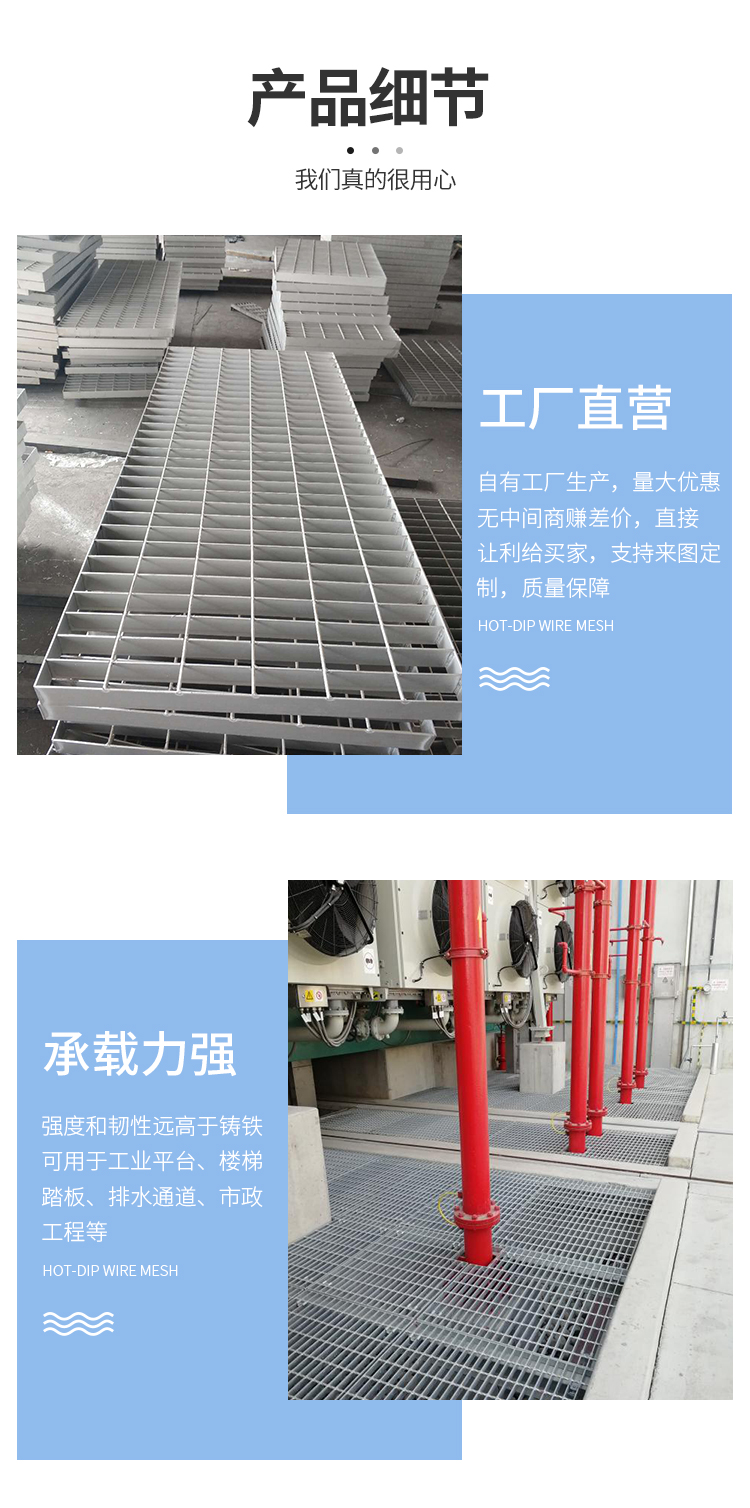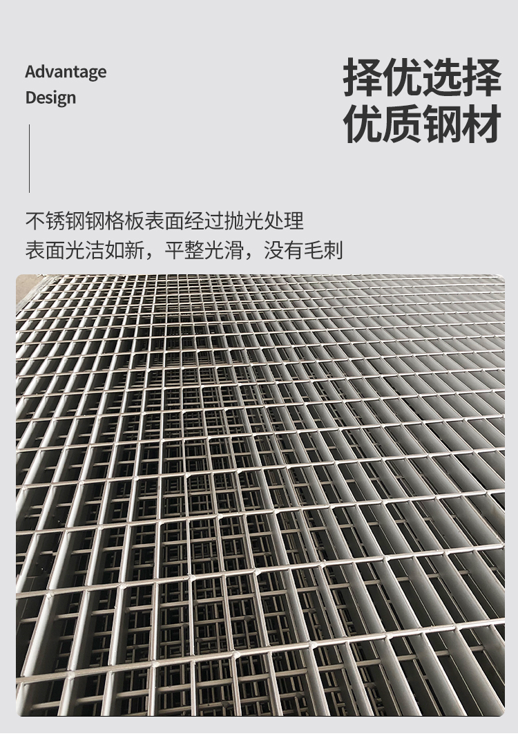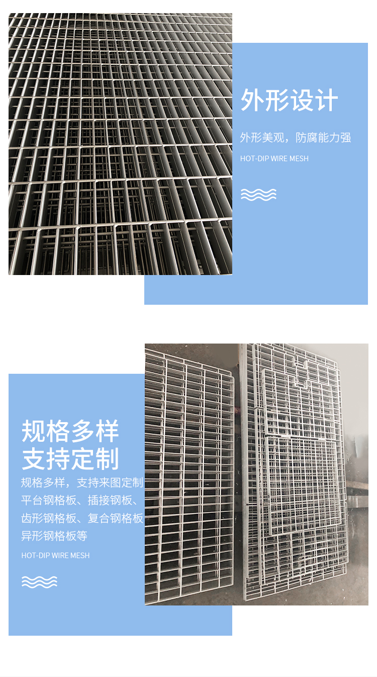 产品简介:格栅板是用扁钢按照一定的间距和横杆进行交叉排列,并且焊接成中间带有方形格子的一种钢铁制品,主要用来做水沟盖板,钢结构平台板,钢梯的踏步板等,横杆一般采用经过扭绞的方钢。钢格栅板一般采用碳钢制作,外表热镀锌,可以起到防止氧化的作用。也可以采用不锈钢制作.钢格栅板具有通风,采光,散热,防滑,防爆等性能。1.强度高,自重轻;2.防腐能力强,经久耐用;3.外形美观,表面亮泽;4.不积污物,不积雨雪,不积水,自清洁,易于维护;5.通风,采光,散热,防滑,防爆性好;6.便于安装及折卸 。